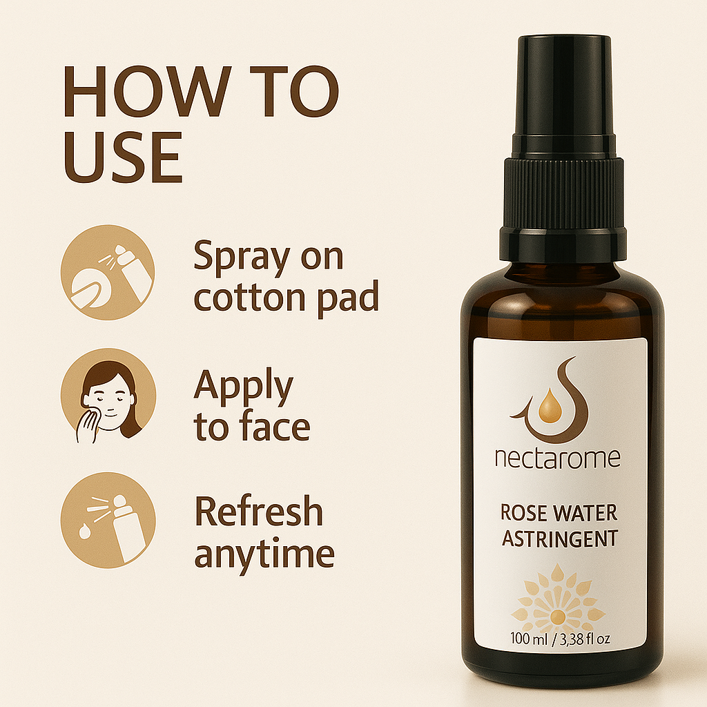 - Spray Rose Water on your face and body to tone and refresh your skin, leaving it soft and relaxed.